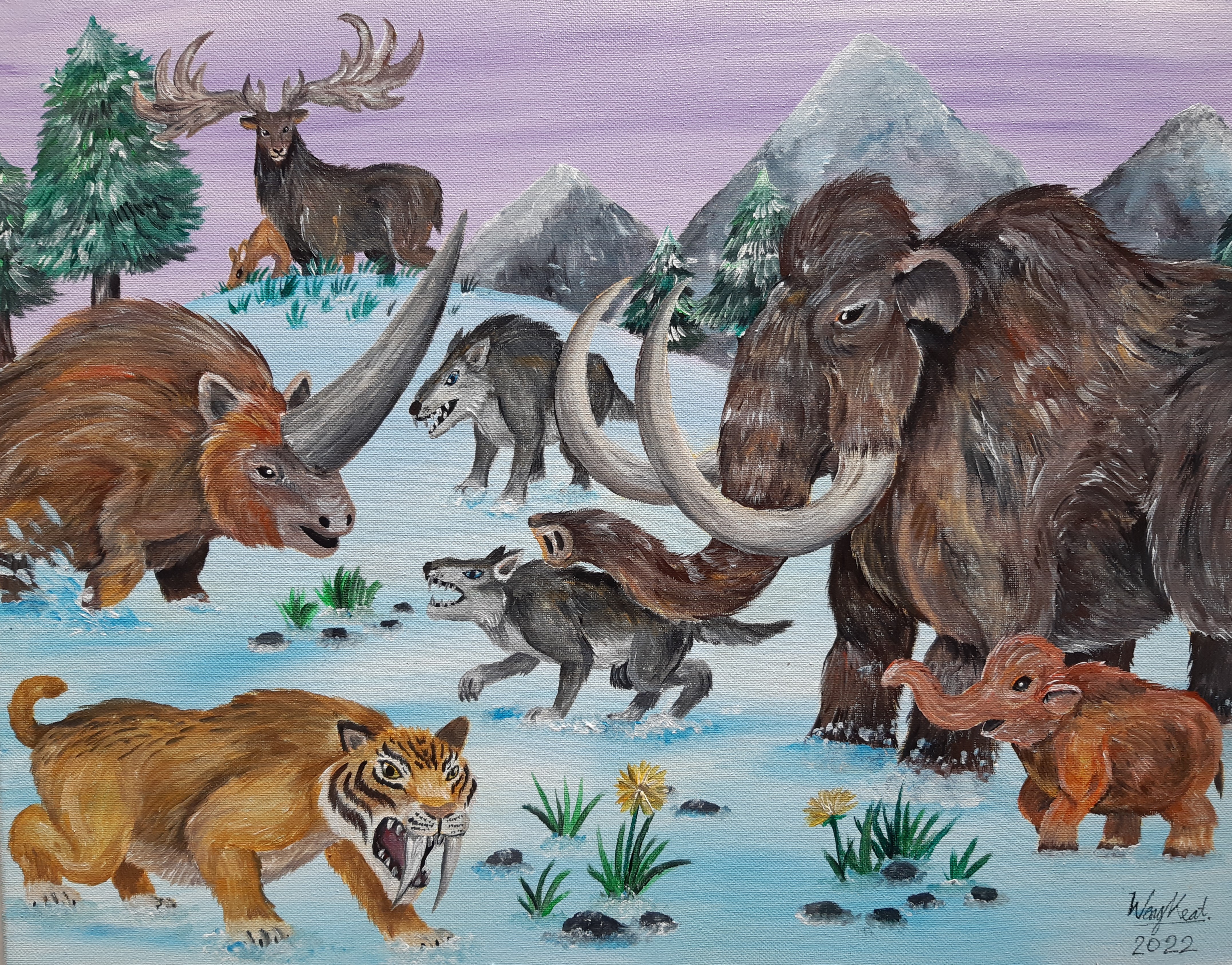 The Pleistocene epoch (2.5 million to 11,700 years ago) was marked by at least four ice ages, during which ice sheets spread from north to south, covering much of the northern Hemisphere including Europe, northern Asia and North America. For most animals, the conditions were inhospitable for life, but several large and spectacular animals have evolved adaptations such as thick fur and thick layers of fat to specially suit to the freezing cold conditions of the Pleistocene ice ages. The painting depicts a scene in a tundra landscape in Siberia.